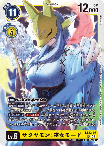 - ②With the resistance from [ST22-10 Amethyst Mandala] you can ensure [Sakyamon: Maid Mode] stays in play and then when attacked during the opponent’s turn you can blast digivolve into [ST22-05 Sakuyamon ACE]! Change to attacking with the various Option cards.